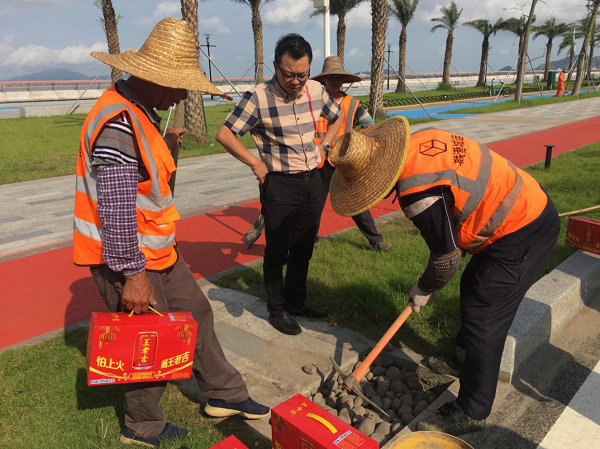 慰問(wèn)組一行先后來(lái)到金山公園、金灣路,分別慰問(wèn)園林綠化、市政道路管養(yǎng)、水利等一線作業(yè)員工?!?/span>你們辛苦了,感謝你們?yōu)槲拿鞒鞘懈冻龅男燎诤顾团Α?,鄒湘斌董事長(zhǎng)對(duì)他們?yōu)榫S護(hù)城市環(huán)境衛(wèi)生作出的努力表示感謝,進(jìn)一步了解了員工的工作情況及困難,并再次叮囑他們在烈日和高溫下作業(yè)要采取有效防暑降溫和安全生產(chǎn)保障措施,以健康的身體和愉悅的心情投入到工作中。