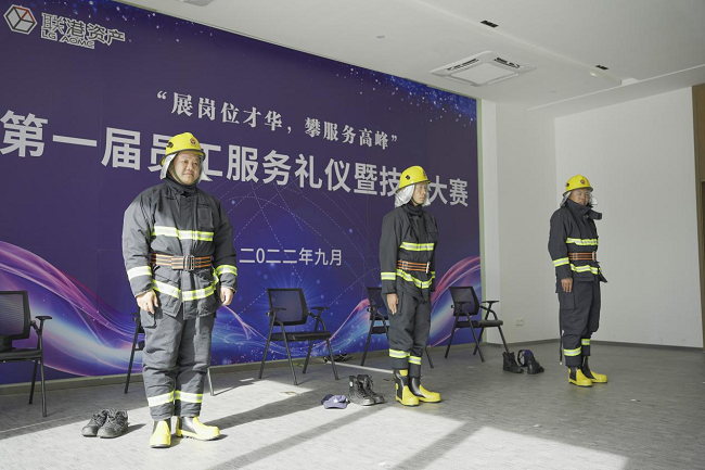 比賽現(xiàn)場消防服的快速穿戴展示服務(wù)安保人員的專業(yè)高效、快速響應(yīng)的應(yīng)變能力。平日里,他們24小時不間斷巡邏,守護業(yè)主安全,項目安全的背后離不開他們?nèi)諒?fù)一日的用心耕耘。