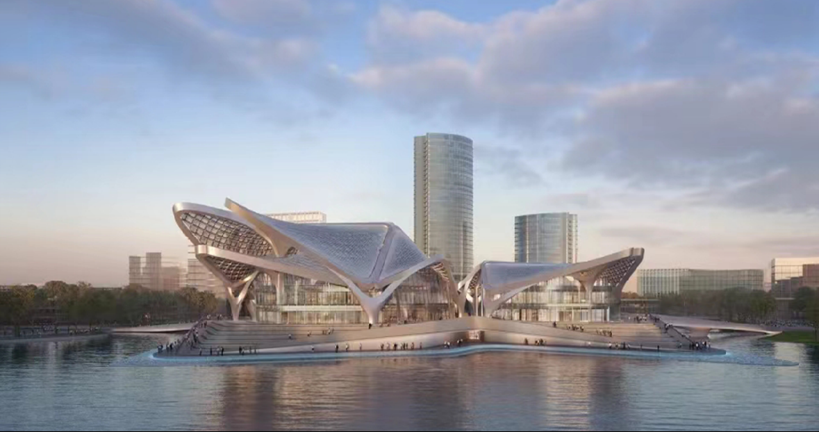 扎哈遺作,金灣地標。金灣航空城市民藝術(shù)中心位于金灣航空城中心湖正中心,四面濱水,金帆大道下穿而過??偨ㄖ娣e99582.39平方米,共有四棟建筑物,分別為1200座的大劇院、500座觀眾的多功能廳、4000多平方米的藝術(shù)館、7000多平方米的科普館。